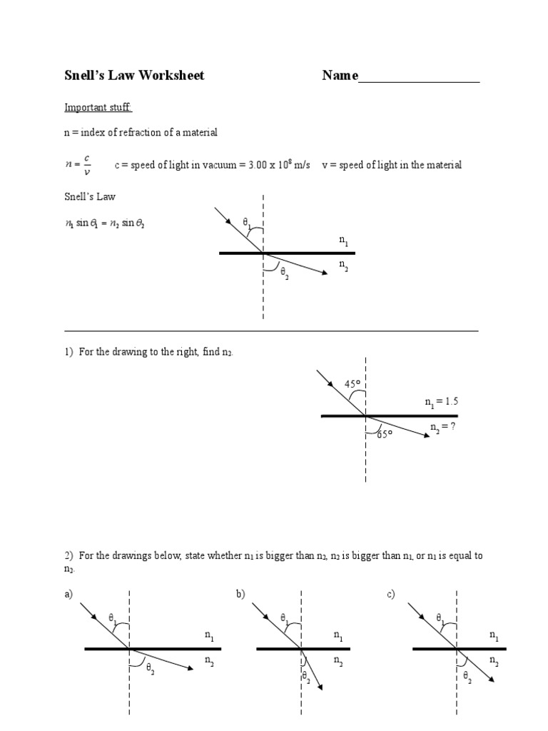 Snells Law - GeoGebra View Worksheet. Ohm Law And Power Equation Practice Worksheet Answers Intrepidpath. 2 For the drawings below state whether n1 is bigger than n2 n2 is bigger than n1 or n1 is equal to n2.